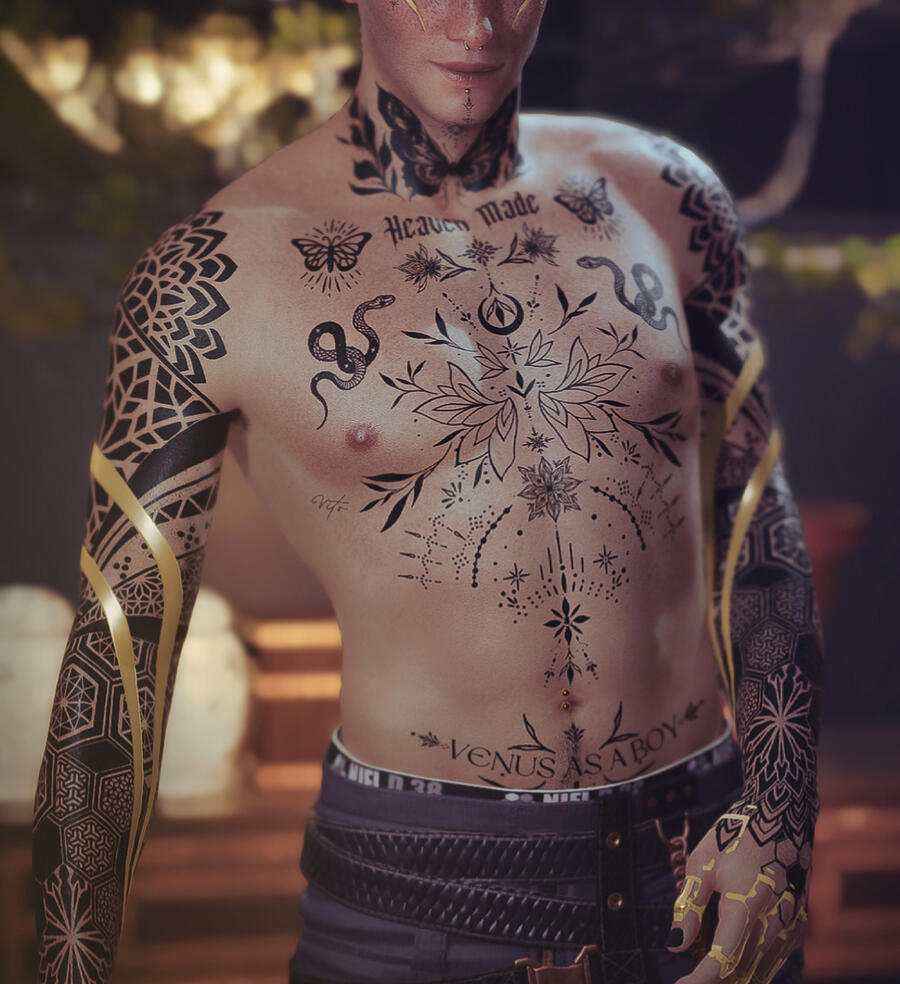 The mod will be packed how you prefer it to be - VTK for femme V, KS Unique V for masc + femme V, or regular overlay UV for masc + femme V (Note: the arms will be mirrored with this method but it does not require a framework)I can create a wide variety of styles/designs, so the best thing would be to bring me examples and we can talk more about what you'd like specifically for your OC. I'm more than happy to give them tattoos that are specific to their character. Symbolism and such.Turnaround time is one week from the time I begin the mod and is dependent on complexity. Very complex tattoos may take longer.I will not copy tattoos - if you ask me to copy another OCs tattoos, I will decline the commission.I will not create any tattoos that are homophobic, transphobic, racist, bigoted, or sexist. If you ask, I will decline the commission.